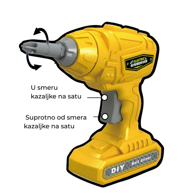 Električni odvijač i razni nastavci omogućavaju deci da šrafe, sklapaju i rastavljaju kao pravi majstori. Kroz igru uče strpljenje, preciznost i osnovne veštine rukovanja alatom.