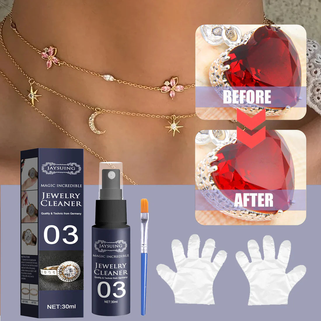 Naše sredstvo za čišćenje nakita efikasno uklanja prljavštinu, nečistoće i tamne mrlje sa svih vrsta nakita i metala, uključujući dijamante, ogrlice i druge dragocene kamene ukrase.